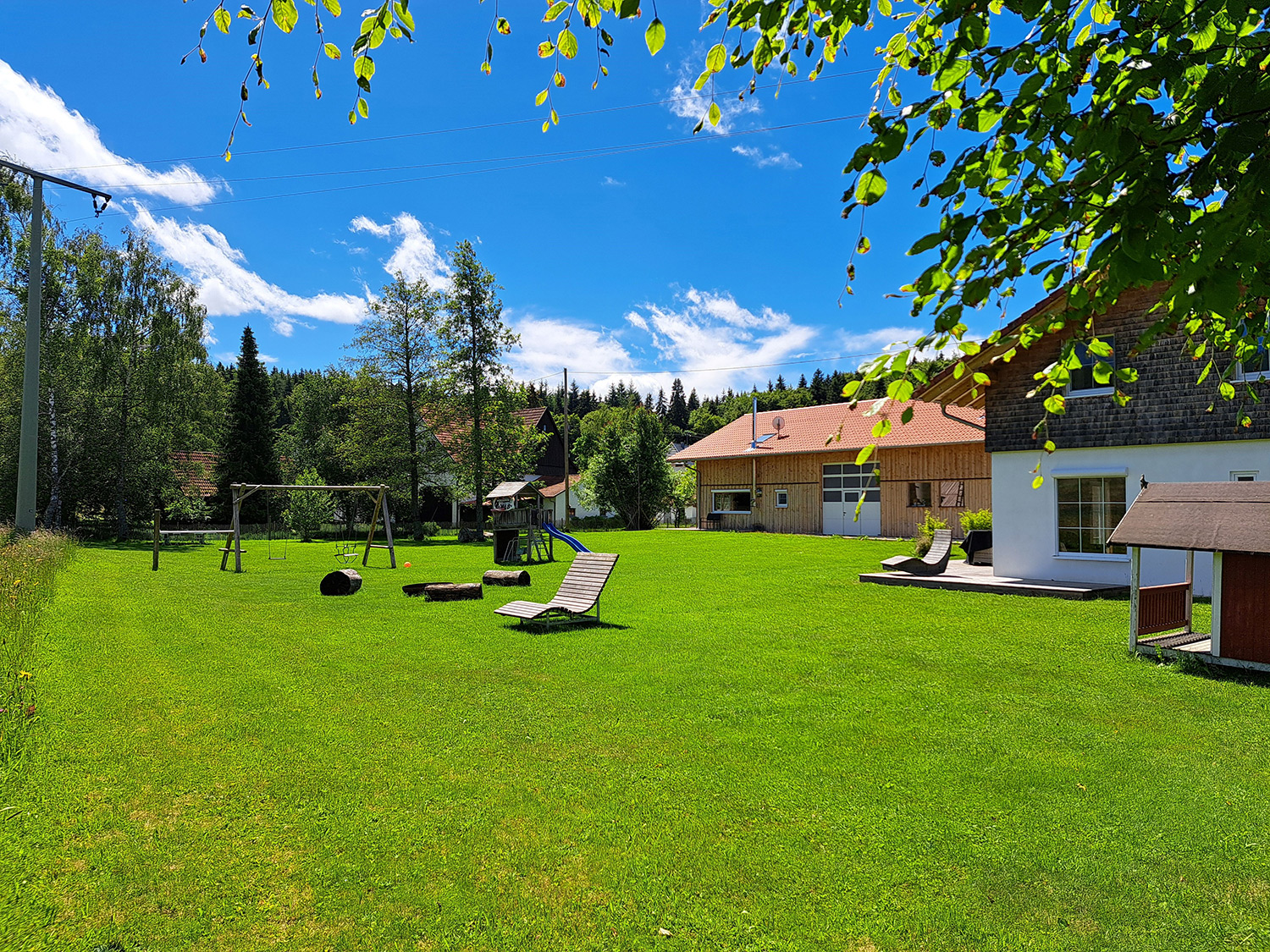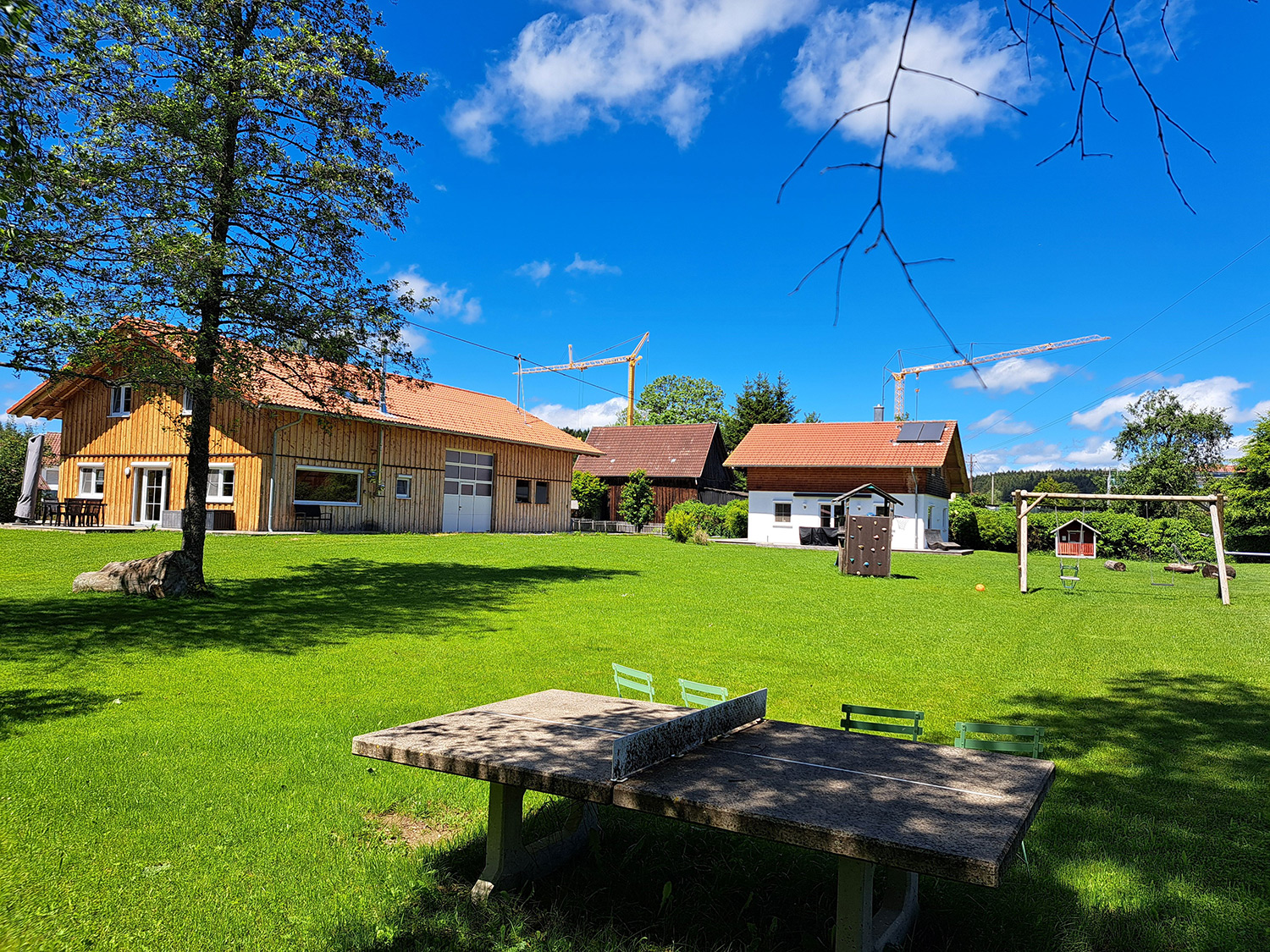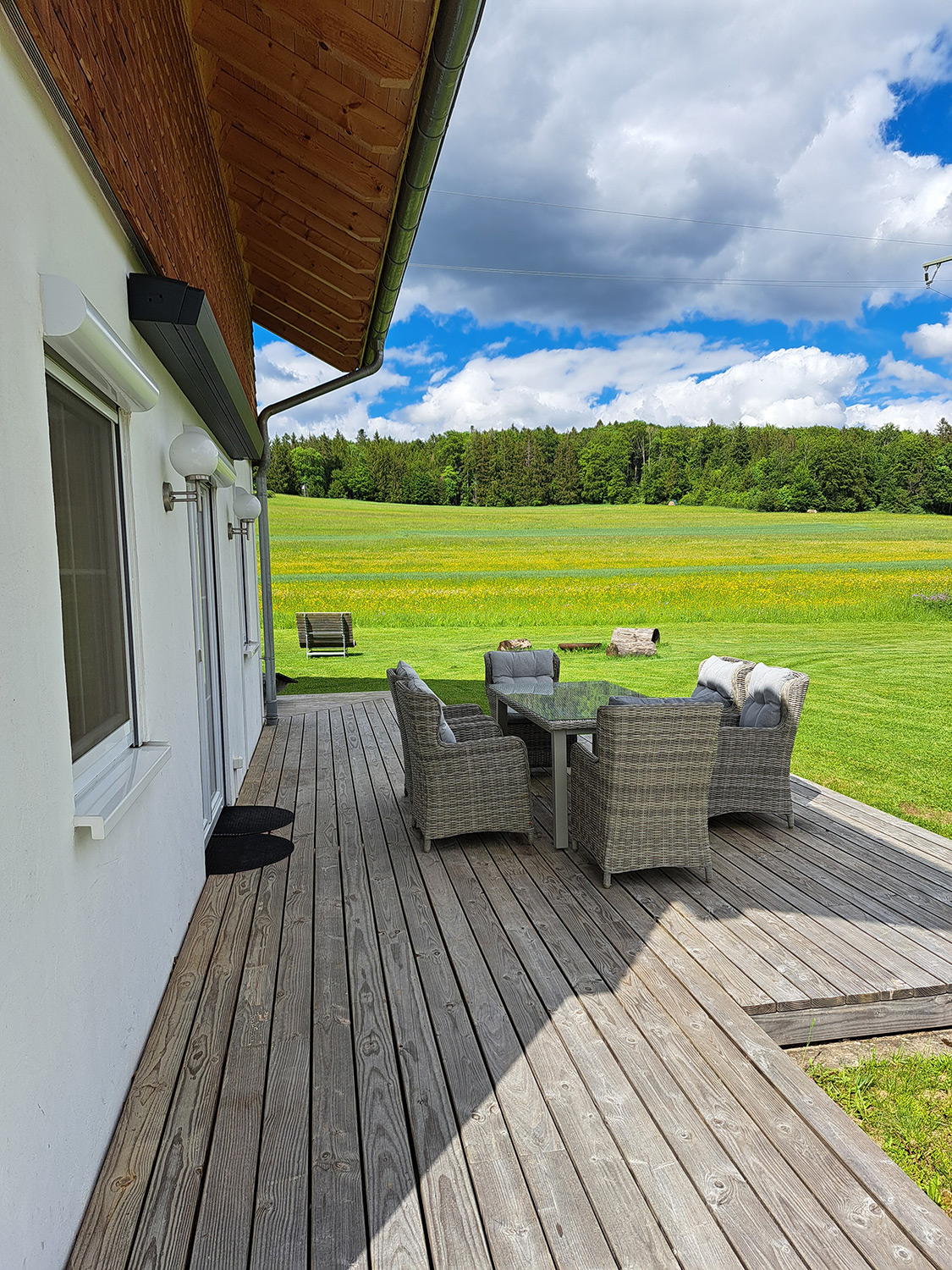 Große Rundumterrasse mit großem eingepflanztem Garten mit schönem Spielturm für Kinder, Schaukeln, Reck, Tischtennisplatte, Ausreichend viel Stellplatz für zwei Fahrzeuge, rundum Gartenbänke und eine Sitzgruppe auf der Terrasse mit elektrischer Markise. Und außerdem eine wirklich geniale Aussicht auf die Umgebung. Mit etwas Glück kann man Wildtiere beobachten.