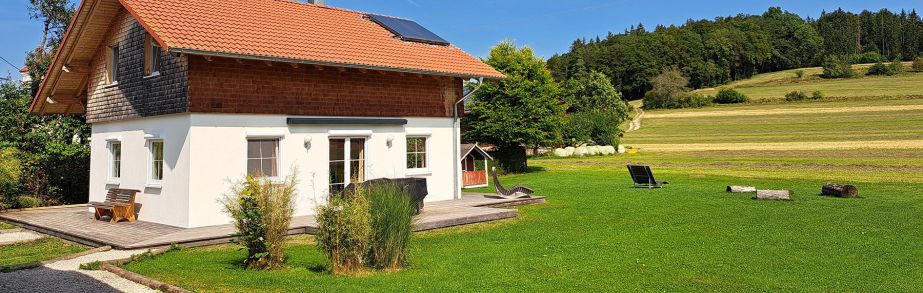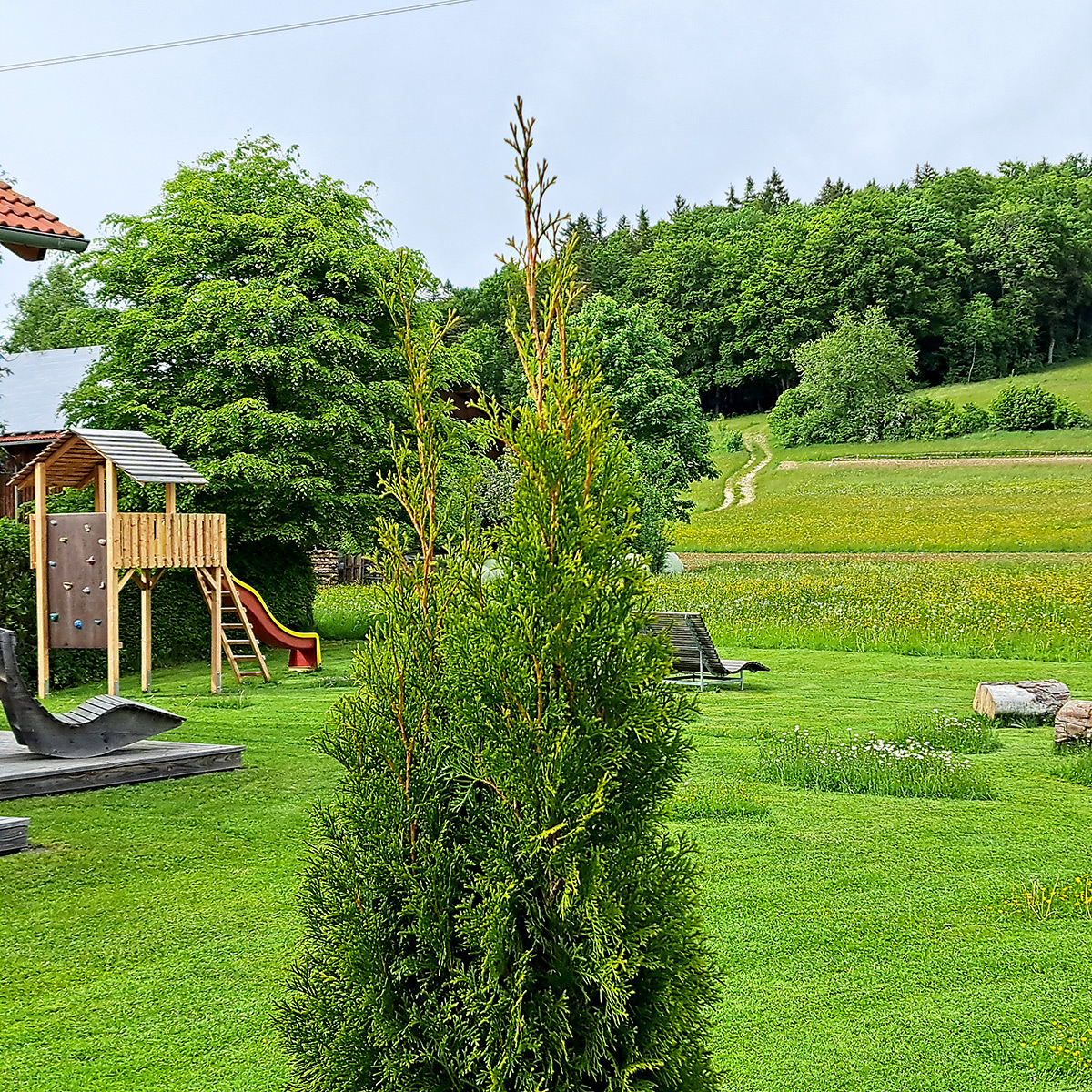 Große Rundumterrasse mit großem eingepflanztem Garten mit schönem Spielturm für Kinder, Schaukeln, Reck, Tischtennisplatte, Ausreichend viel Stellplatz für zwei Fahrzeuge, rundum Gartenbänke und eine Sitzgruppe auf der Terrasse mit elektrischer Markise. Und außerdem eine wirklich geniale Aussicht auf die Umgebung. Mit etwas Glück kann man Wildtiere beobachten.